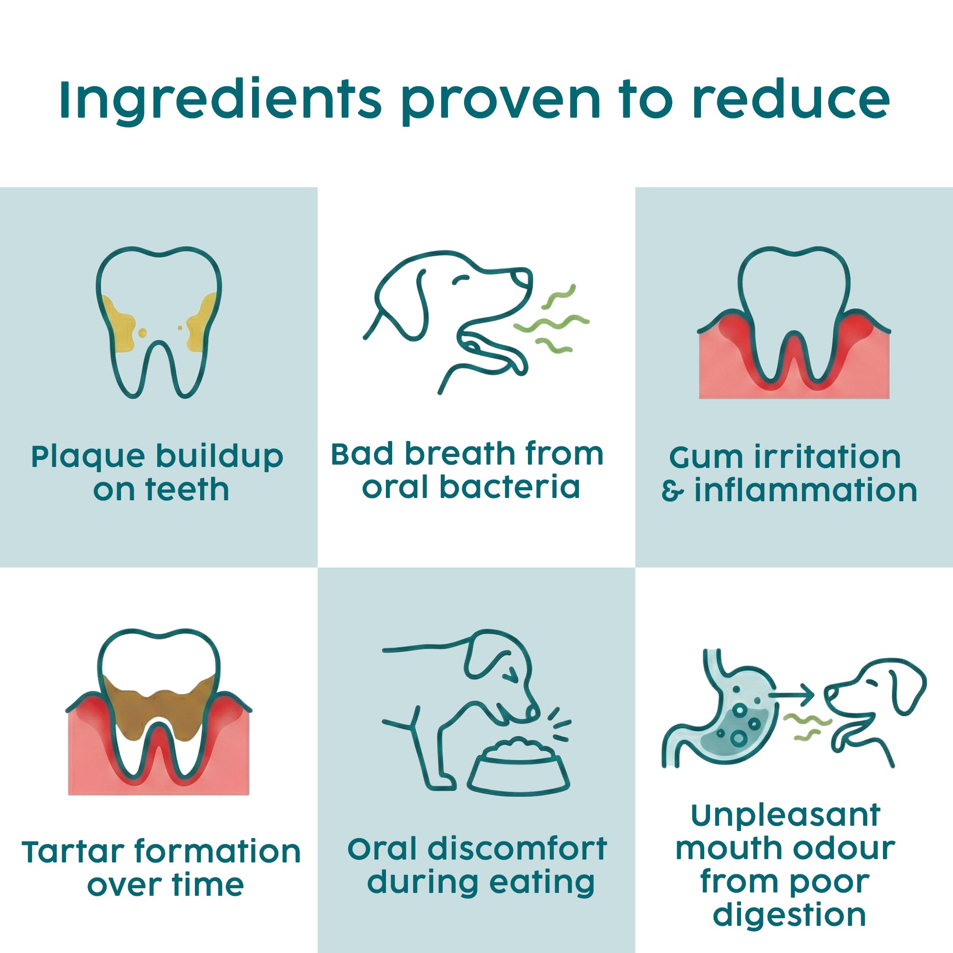 A natural, probiotic-powered blend of seaweeds, herbs, and beneficial bacteria formulated for dogs and cats. Helps balance the oral microbiome, reduce plaque-causing bacteria, eliminate bad breath, and support cleaner, healthier teeth β ideal for multi-pet households.