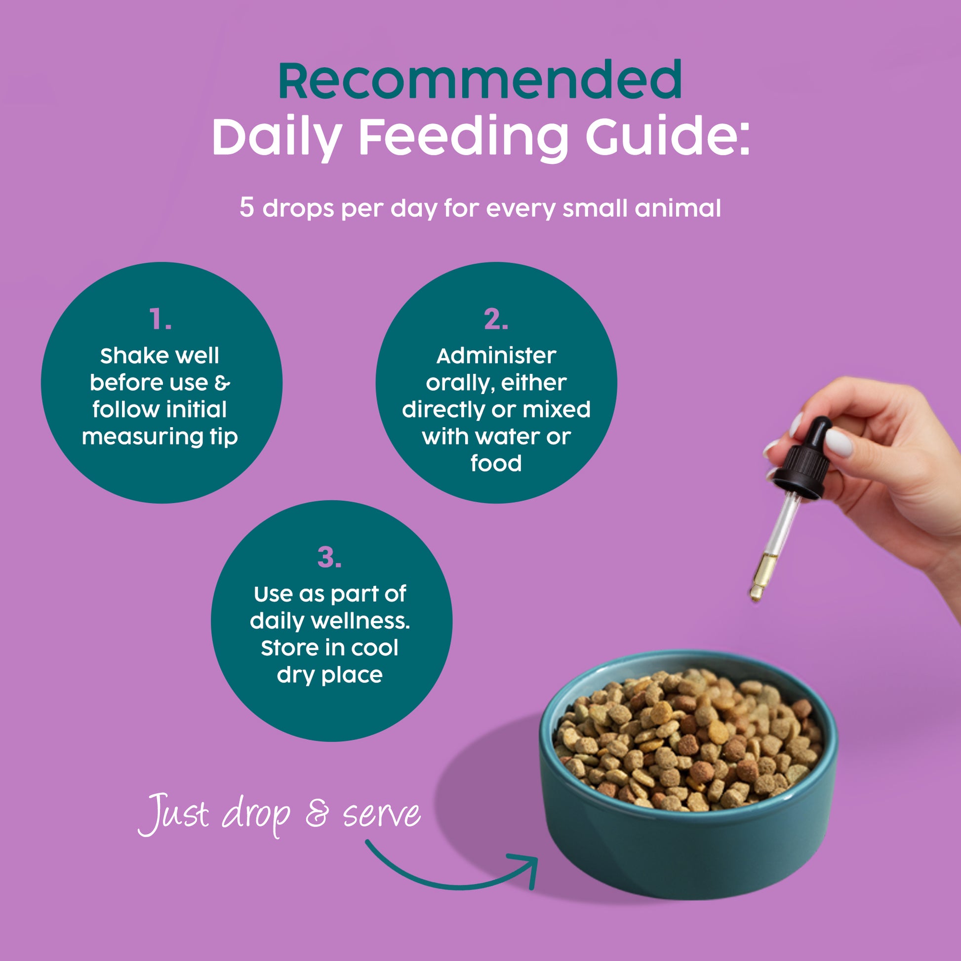 30ml bottle with 1ml dropper tube for accurate, stress-free dosing. Recommended: 5 drops daily (adjust according to size and vet advice). Administer directly or mix with food.